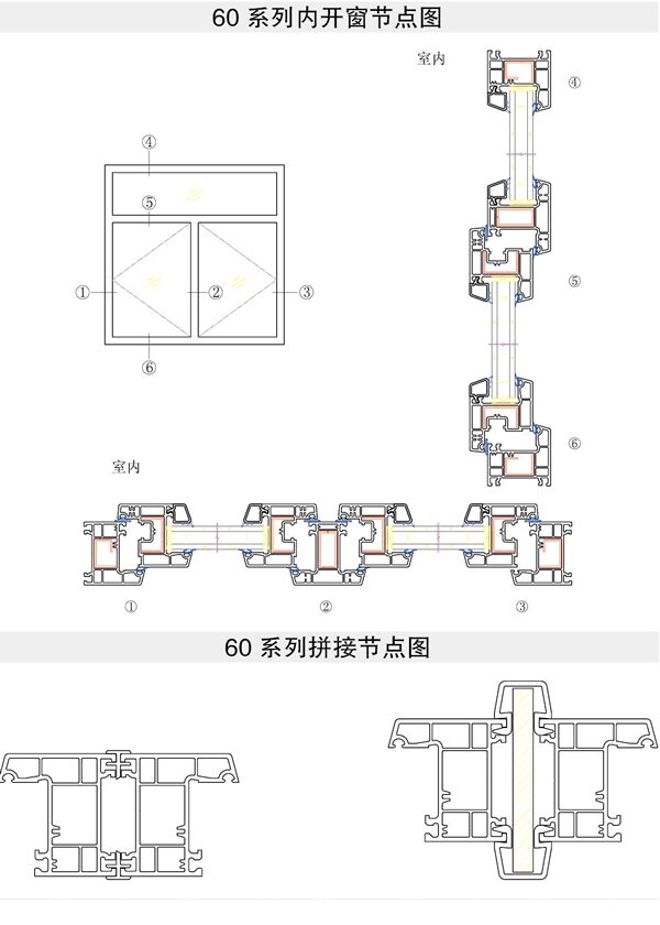型材斷面設(shè)計(jì)合理 1、60系列主型材采用三腔結(jié)構(gòu),設(shè)有獨(dú)立排水腔、增強(qiáng)型鋼腔、保溫隔音腔,使熱傳導(dǎo)K值在2.0以下。 2、合理的斷面設(shè)計(jì)相應(yīng)增大了X軸慣性距,使負(fù)荷性能明顯提高。 3、斷面的三道密封設(shè)計(jì),使窗的氣密性、水密性、隔音性大大提高,完全滿足嚴(yán)寒地區(qū)用戶需求。
