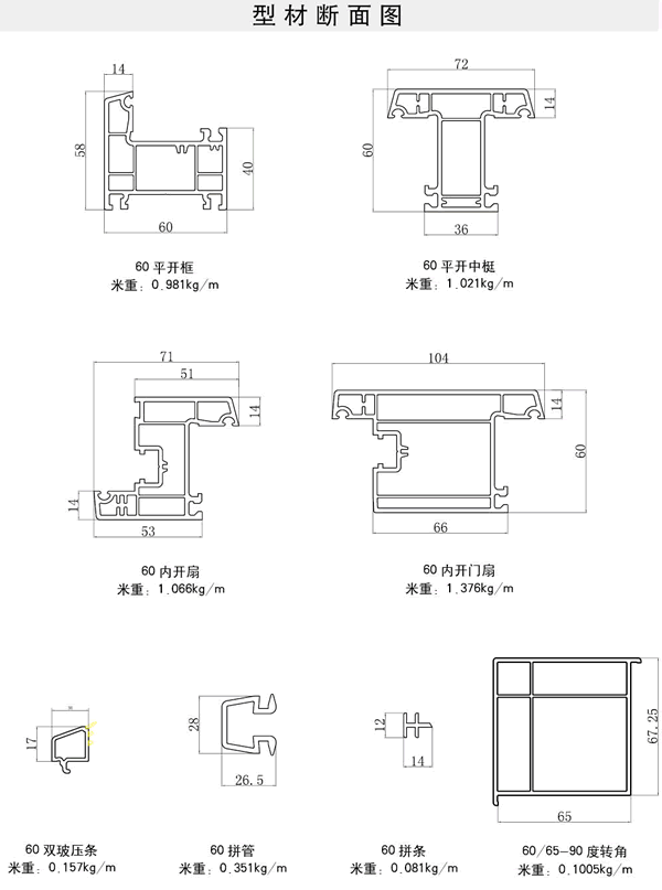 型材斷面設(shè)計合理 1、60系列主型材采用三腔結(jié)構(gòu),設(shè)有獨立排水腔、增強(qiáng)型鋼腔、保溫隔音腔,使熱傳導(dǎo)K值在2.0以下。 2、合理的斷面設(shè)計相應(yīng)增大了X軸慣性距,使負(fù)荷性能明顯提高。 3、斷面的三道密封設(shè)計,使窗的氣密性、水密性、隔音性大大提高,完全滿足嚴(yán)寒地區(qū)用戶需求。
